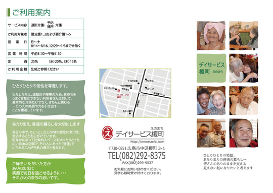 広島市街中にあるデイサービスのご利用案内のパンフレット。わかりやすさ、ウェブサイトとの調和を目指しました。